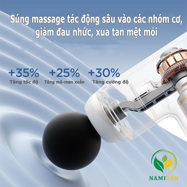 Súng massage hoạt động như một thiết bị xoa bóp chuyên nghiệp, giúp giảm căng thẳng trong các nhóm cơ. Tính linh hoạt của cơ bắp được tăng cường nhờ việc giảm độ căng và cải thiện lưu thông máu đến vùng cơ bị ảnh hưởng.